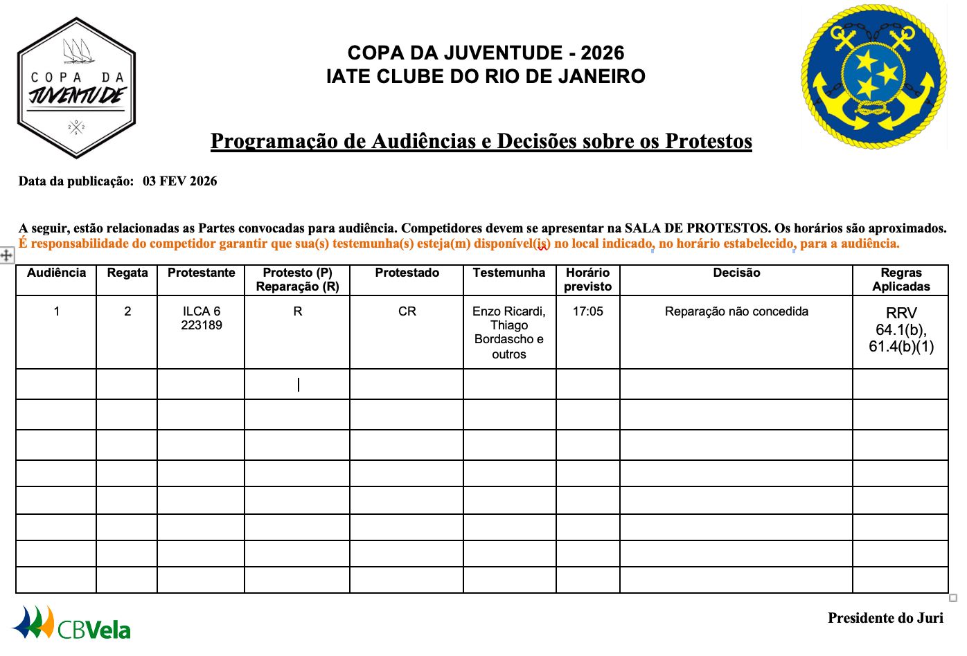 * Aviso aos Competidores nº 03 - Regatas 6/02/2026