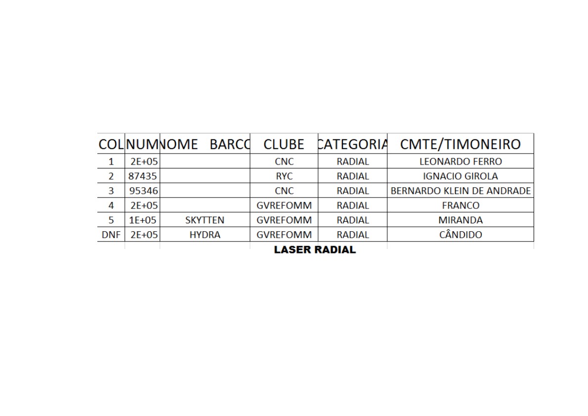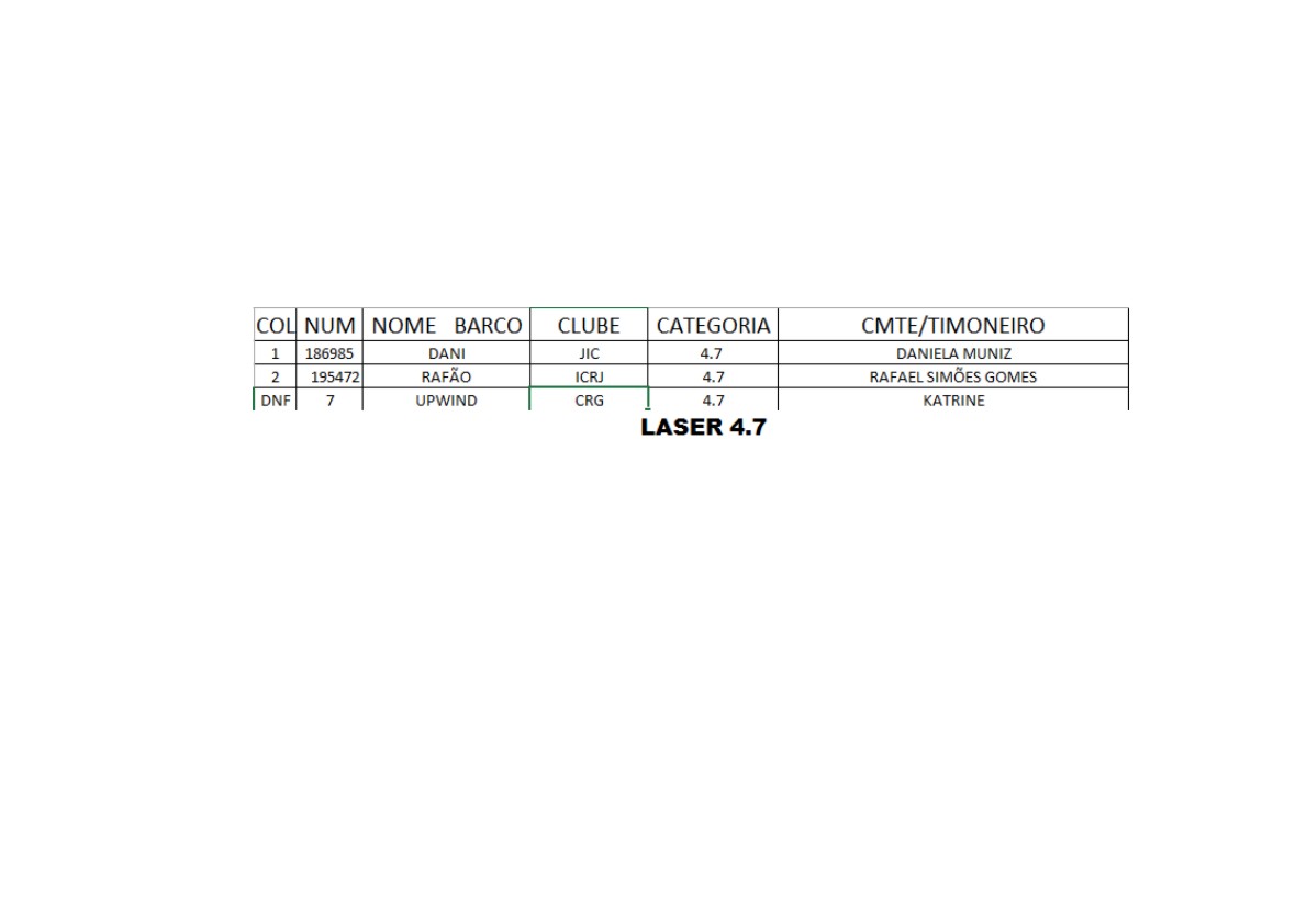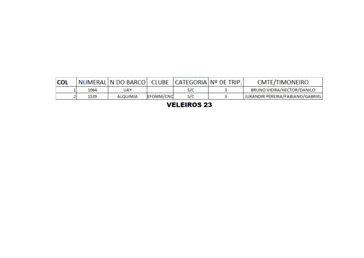 Resultados: Bico de Proa Brasília 32 Dingue Escaler Holder J24 Laser 4.7 Laser Radial Laser Std. Multicasco Open Bic Optimist Estreante Optimist Veterano ORC e IRC Ranger 22 RGS Snipe Velamar 22 Veleiros 23